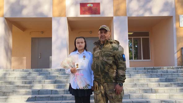 Çак медале ăна 589-мĕш мотострелковăй полк командованийĕ ячĕпе ятарлă çар операцине хутшăнакан Евгений Робертович шкулти линейкăра савăнăçлă лару-тăрура пачĕ. Мероприятие Куславкка муниципаллă округăн Карачри территори пайĕн начальникĕ Ираида Ларионова, Илепарти, Якуньккăри, Минкĕшри тата Куславкка хулинчи хастар волонтерсем хутшăнчĕç.