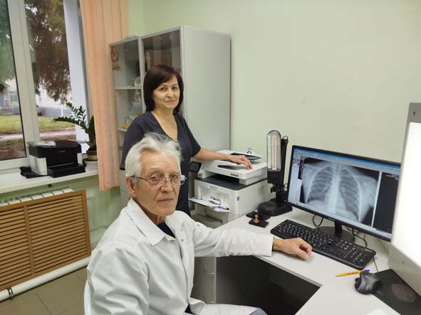 Ÿкерчĕк çинче: районти тĕп больницăри пайăркасемпе диагностика тăвакан уйрăм заведующийĕ - врач-рентгенолог Аркадий Степанович Силов тата Ольга Николаевна Спиридонова рентген-техник.