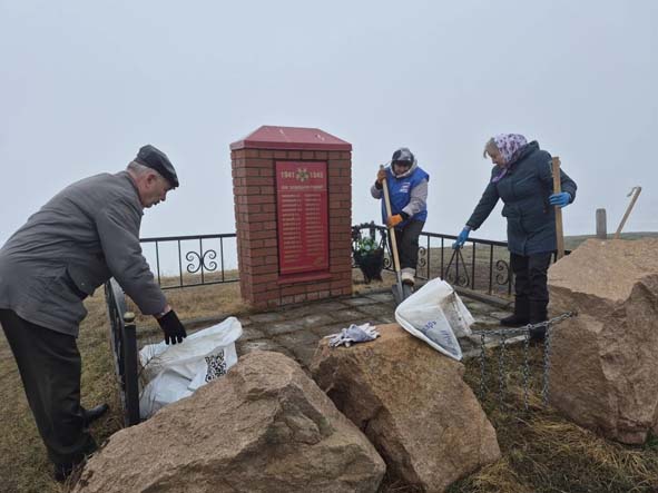 Здесь, у памятника воинам землякам, отдавшим жизни в годы Великой Отечественной войны, вместе с активом Партии «Единая Россия» трудились члены Солдыбаевского первичного отделения ради сохранения природы и исторической памяти.