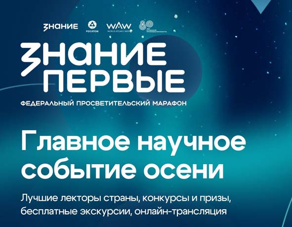 26 и 27 сентября Приволжский федеральный округ примет на своей территории просветительский марафон Знание.Первые, приуроченный к 80-летию атомной промышленности России. В Нижнем Новгороде и Саранске для школьников и студентов выступят государственные и общественные деятели, лидеры бизнеса, ученые, спортсмены, Герои страны, мастера культуры и искусства. Они расскажут о достижениях в атомной промышленности, о перспективах развития в различных сферах, какие возможности открываются перед молодыми людьми и какой видят Россию будущего. Организатор марафона — Общество «Знание» при поддержке ГК «Росатом».